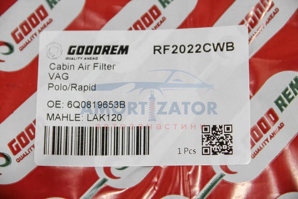 Фільтр салону Audi A2/Fabia/Roomster/Polo/Seat 02- (вугільний) GOODREM RF2022CWB