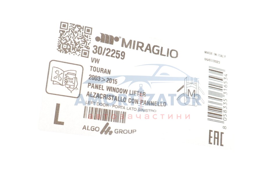 Бренд MIRAGLIO наравне с другими тремя брендами LIFT TEK, ELECTRIC-LIFE И PMM принадлежит компании ALGO GROUP, производящей и поставляющей стеклоподъемники и дверные ручки и задвижки для автосборочных предприятий и на рынок послепродажного обслуживания автомобилей. Компания образовалась путем слияния нескольких компаний и, в общей сложности более 60 лет опыта, является лидером на европейском рынке. Сейчас в Европе действуют две фабрики – в Италии и Польше.